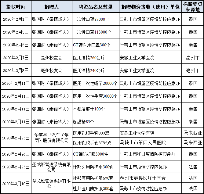 2020年2月1日至3月30日,安徽工业大学教育发展基金会接收并完成发放的社会捐赠物资清单如下: