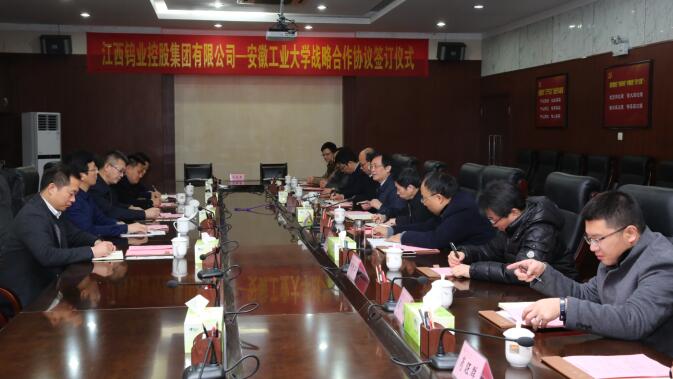 2020年1月3日上午,江西钨业控股集团有限公司副总经理匡兵一行来我校开展产学研交流并签订战略合作协议。江西钨业控股集团有限公司总经理助理张鑫、科技管理部总经理唐德胜,江西江钨硬质合金有限公司执行董事郭永忠、副总经理陈玉柏,校长魏先文、副校长水恒福,科研处及相关学院负责人出席签约仪式。仪式由水恒福主持。会前,校党委书记刘新跃会见了匡兵一行。