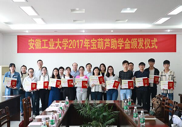 4月3日,“安徽工业大学2017年度宝葫芦助学金颁发仪式”在我校秀山校区汇文楼B304会议室举行。安徽宝葫芦信息科技集团副总裁程庆乐、人力行政部副总理鄢启茹,商学院党委书记黄国才、校友工作处副处长宁永球、校学生工作部副部长卫军帅、计算机学院团委书记王颖之,商学院相关辅导员,全体受资助学生参加了本次助学金颁发仪式。仪式由商学院副院长章铁生主持。