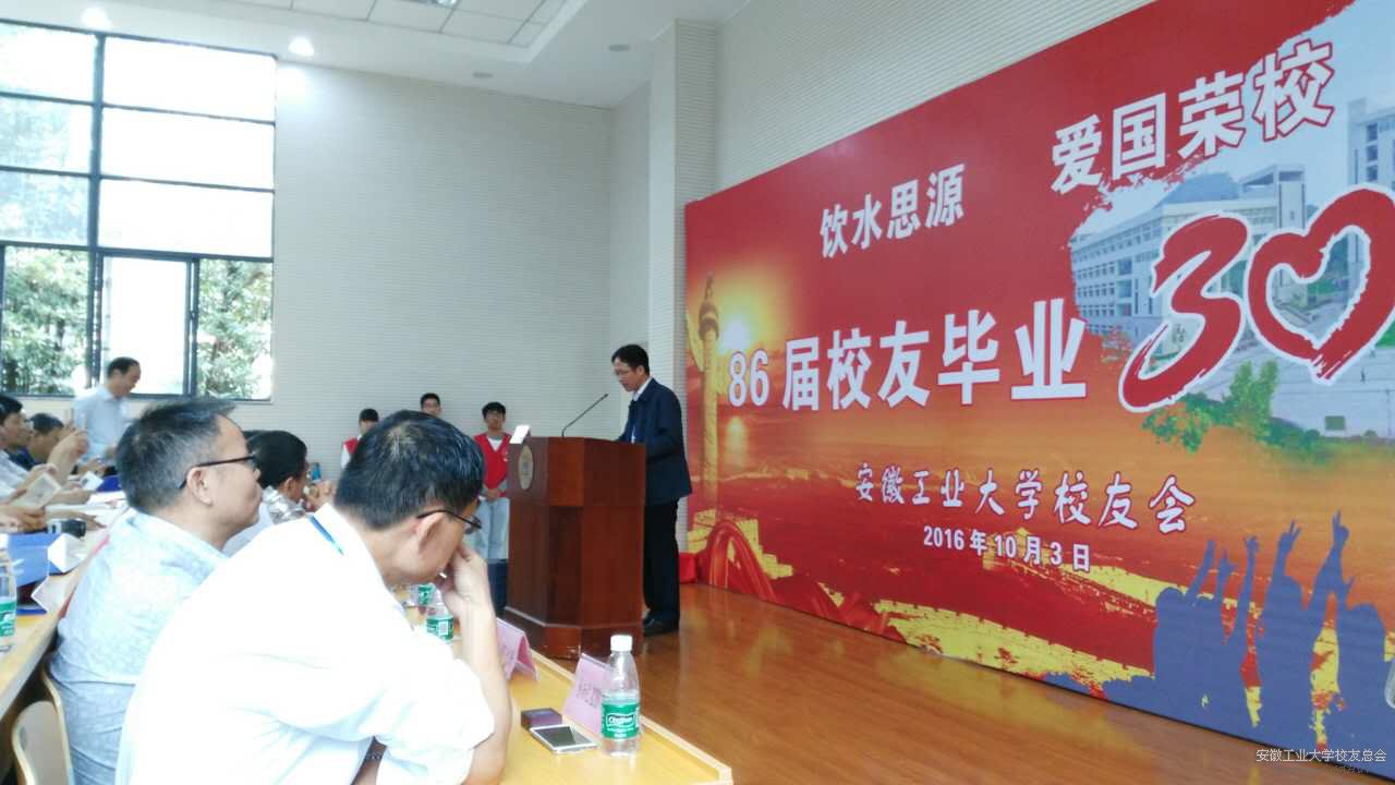 10月3日上午,86届校友毕业30周年集中交流大会在佳山校区3号阶梯教室隆重举行。受李家新校长委托,副校长、安徽工业大学教育发展基金会理事长林钟高出席会议并作了热情洋溢的致辞,代表全校师生对86届全体校友返校交流表示热烈欢迎,对校友们不忘师恩、热心关注母校发展的情怀表示衷心感谢。在简要回顾学校30年来的发展变化,介绍学校在人才培养、科学研究、社会服务等方面取得的成绩后,林钟高动情地说,三十年的别离,三十年的牵挂,无论校友身在何处、业执哪行,都直接或间接地在为母校作贡献;校友走多远,学校的疆域就有多远;校友在哪里,我们安徽工业大学就在哪里。他希望校友们心怀“饮水思源爱国荣校”之情,共担“一个校友一面旗帜”之责,积极关心、关注和参与学校治理,与母校永续互动提升,同发展共进步,欢迎校友们常回家看看。